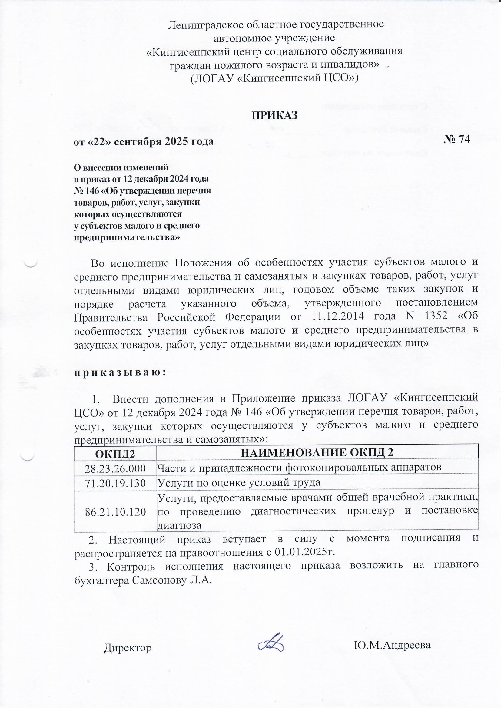 Приказ от 22.09.2025 г. №74 «О внесении изменений в приказ от 12 декабря 2024 г. №146 «Об утверждении перечня товаров, работ, услуг, закупки которых осуществляются у субъектов малого и среднего предпринимательства»